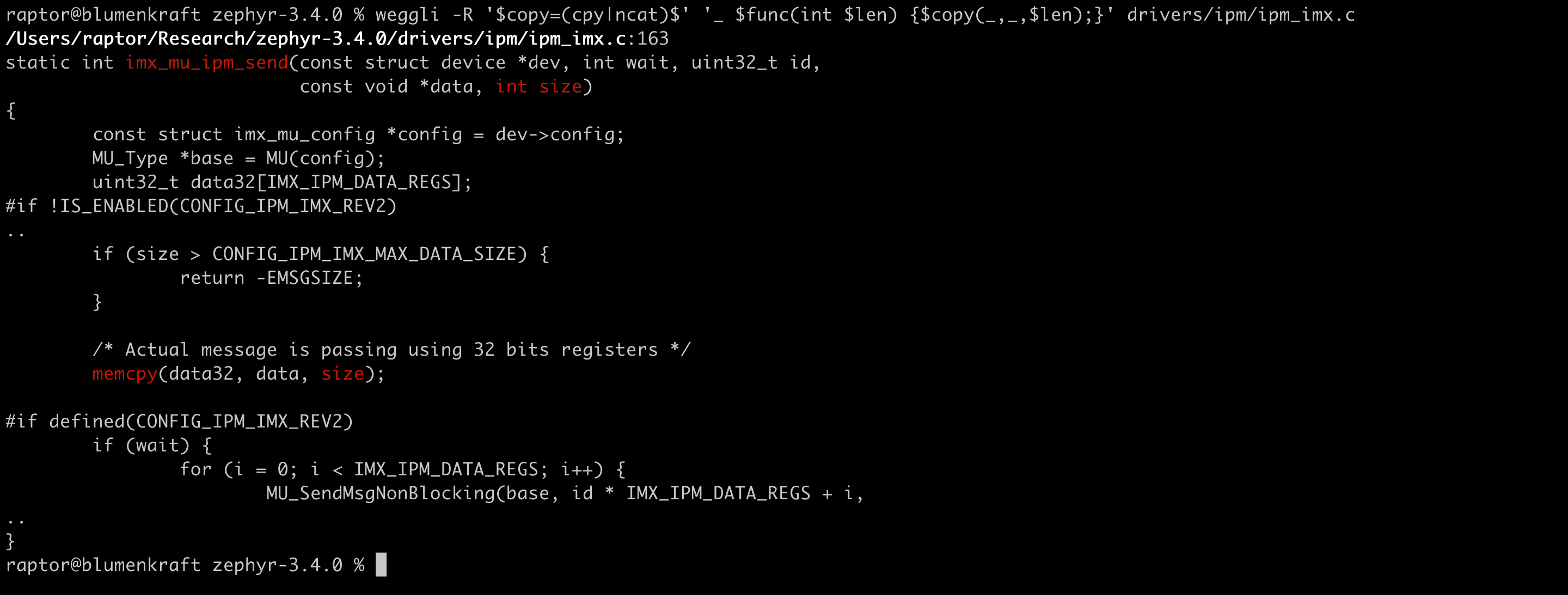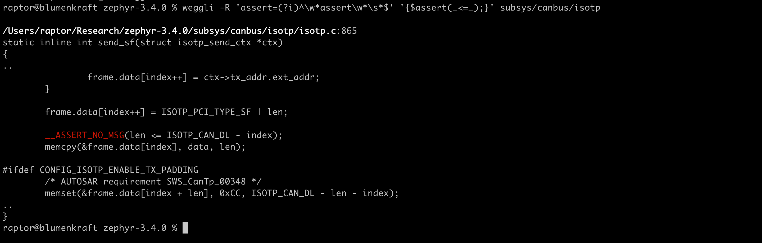 In order to compare these patterns to my Semgrep rules, let’s see how they fare against a familiar codebase. As a sample target, I’ve once again picked Zephyr 3.4.0, which I’ve previously audited with the help of Semgrep.