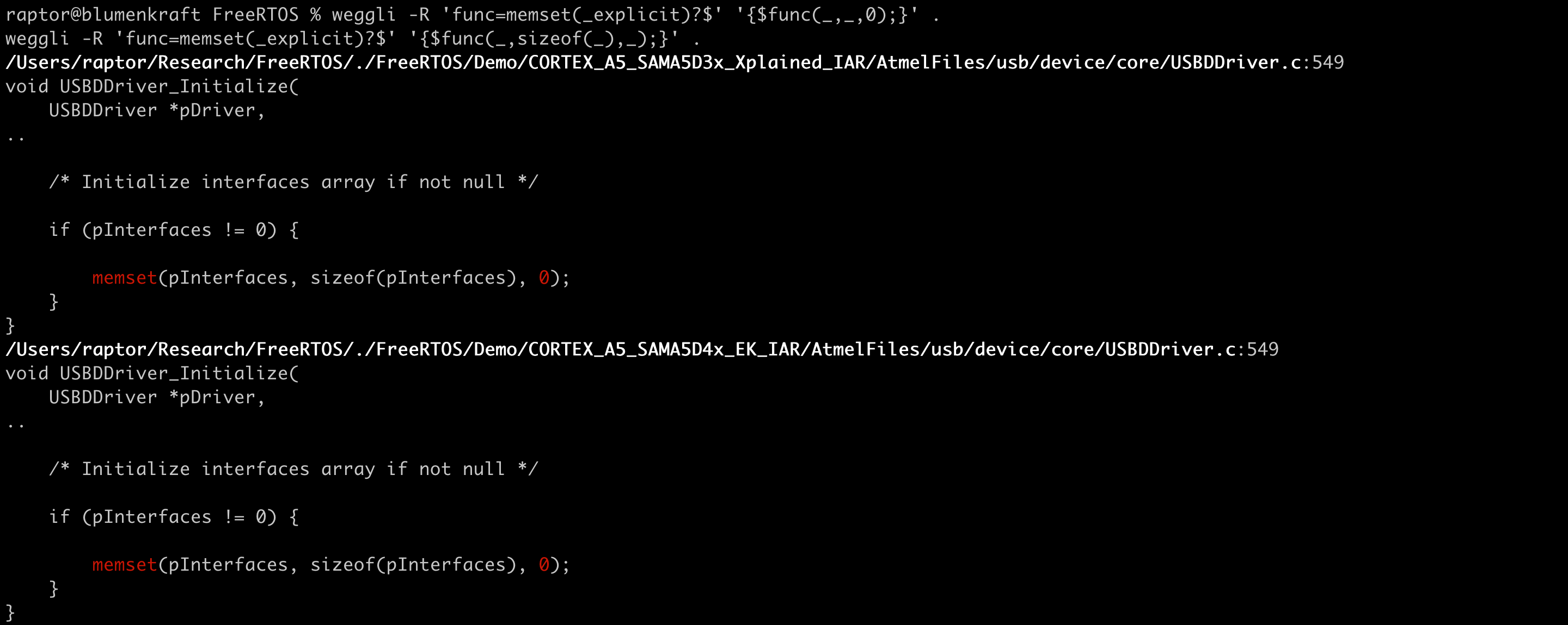 The following screenshot (you may click on images to view them full-size) shows that weggli could detect a buffer overflow due to strcat() use that I’ve reported to the Zephyr project and that is now fixed: