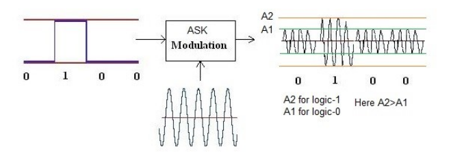 Modulation algorithms take as input a binary string passed as square wave and convert it to an analog signal. Different modulation algorithms use different parameters of the analog wave to encode binary ‘1’ and binary ‘0’, including amplitude, frequency and phase. ASK uses amplitude, as shown in the following picture from RF Wireless World: