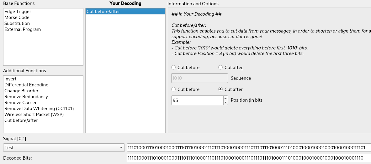 First we simply cut the last bit off (the bit at position 97). It is part of the preamble of the next sequence and it does not contain any information (the “Test” section at the bottom of the tool is very useful during the creation of the encoding routine to see our transformation applied to a bit string):