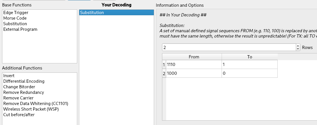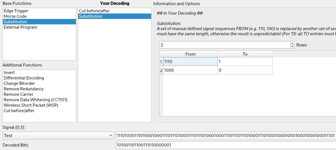 If we try to generate a signal using the data obtained using our custom encoder, it will not work because Universal Radio Hacker will encode our data by inverting the substitution of our protocol but it will not add the ‘1’ bit removed by the “Cut before/after” rule of our encoder. But unfortunately that ‘1’ is necessary, because it is the preamble of the next signal. To overcome this issue, we can simply remove the “Cut before/after” rule of our encoder and leave only the substitution rule:
