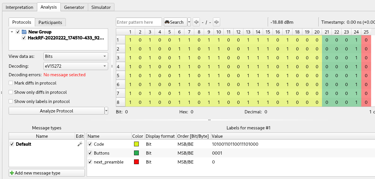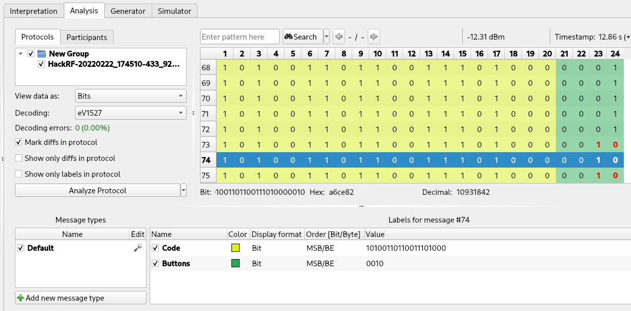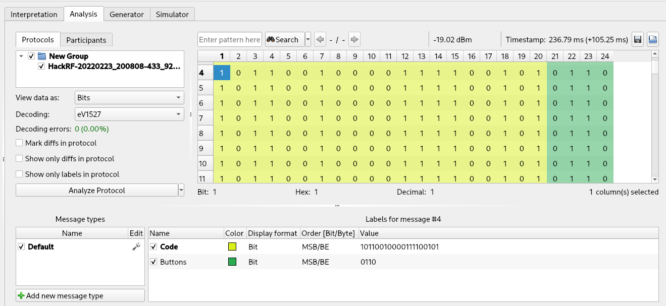 Finally, we can use Universal Radio Hacker labels to color the different sections of our data, simply by selecting the first 20 columns (the code of our remote control), right clicking on the data and selecting “Create label”. Then we can repeat the same procedure for the last 4 columns (the button section). Labels are not useful only for viewing purposes but will be necessary when we will use the “Fuzzer” tool of Universal Radio Hacker (presented later in this article). The result is:
