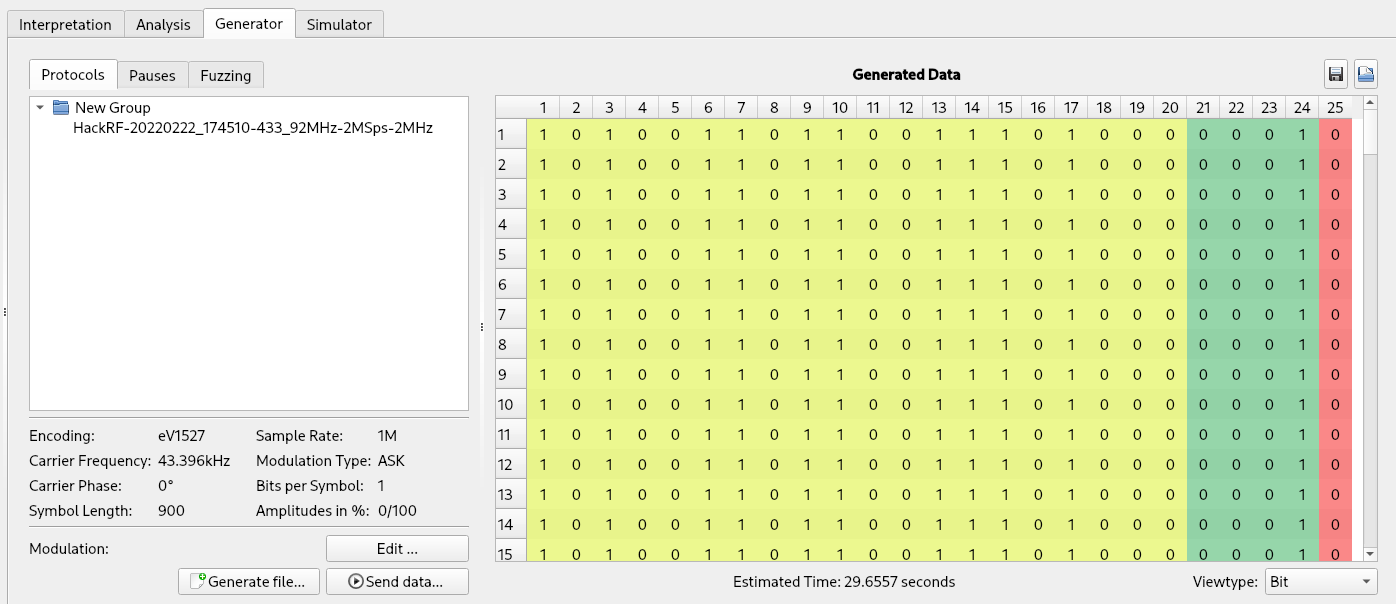 This trailing ‘0’ will be encoded by the Generator tool of Universal Radio Hacker to ‘1000’ but it is not an issue for us because combined with the pause before the next sequence it will create the next preamble (1 followed by 31 zeros).
