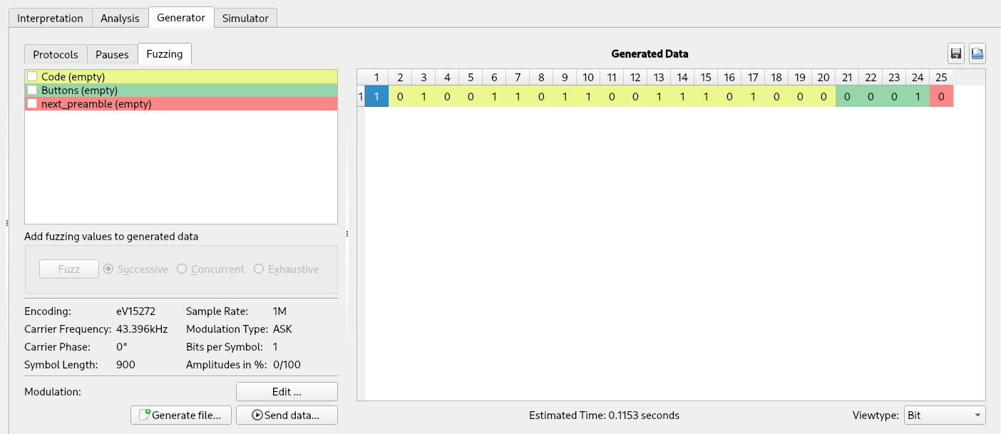 Finally, let’s talk about the brute-force of button bits. The “Fuzzing” sub-tab of the “Generator” tool is made for this purpose. To use the fuzzer it is necessary to set the label in the analysis tab. First it is better to remove all entries of the table but one (otherwise it will concatenate the signals we recorded to the fuzzing signals).