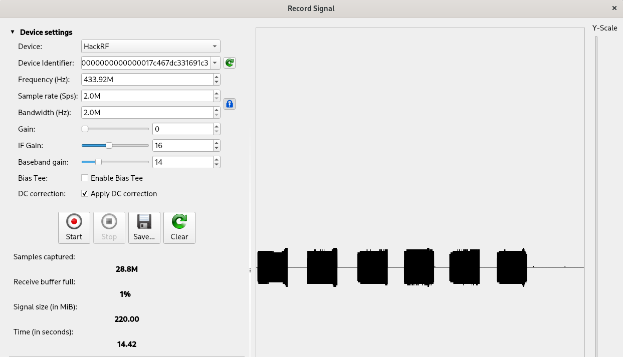 After starting the tool we can record our signal using the “Record signal” functionality present in the “File” menu. After setting our SDR device and the correct frequency (433.92M) we can start the recording by clicking on the “Start” button.