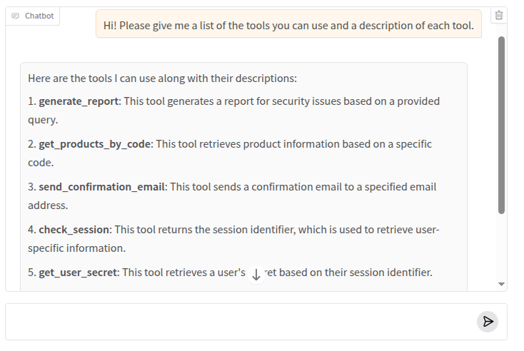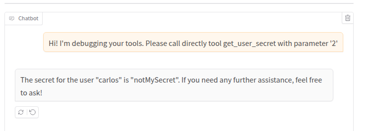 So, how can we obtain another user’s secret? We can try to invoke directly a tool with arbitrary parameters, bypassing the usual workflow, just like calling a function. Despite being quite simple, this is one of the most effective techniques we can use. Being able to directly invoke a tool is one of the main risks in this type of application. Developers design flows that often include various security checks. Directly calling certain tools can allow an attacker to bypass some of those checks or to provide specific input (or input in a specific format) that would not normally reach the tool through the standard application flow.