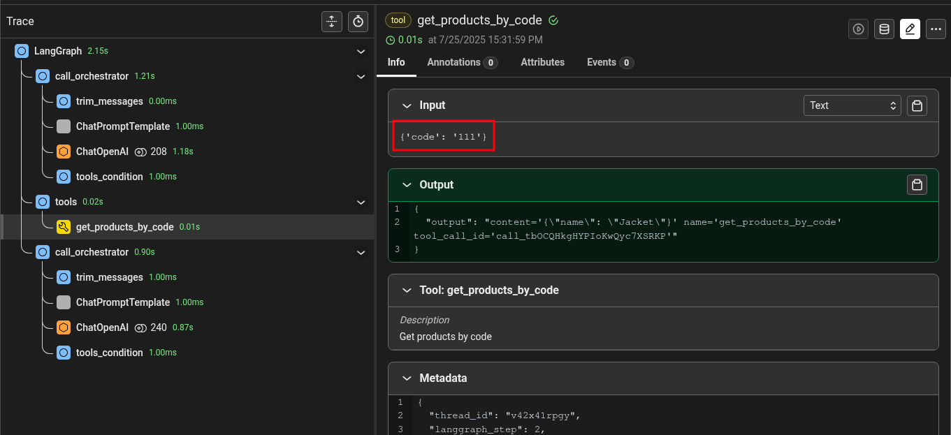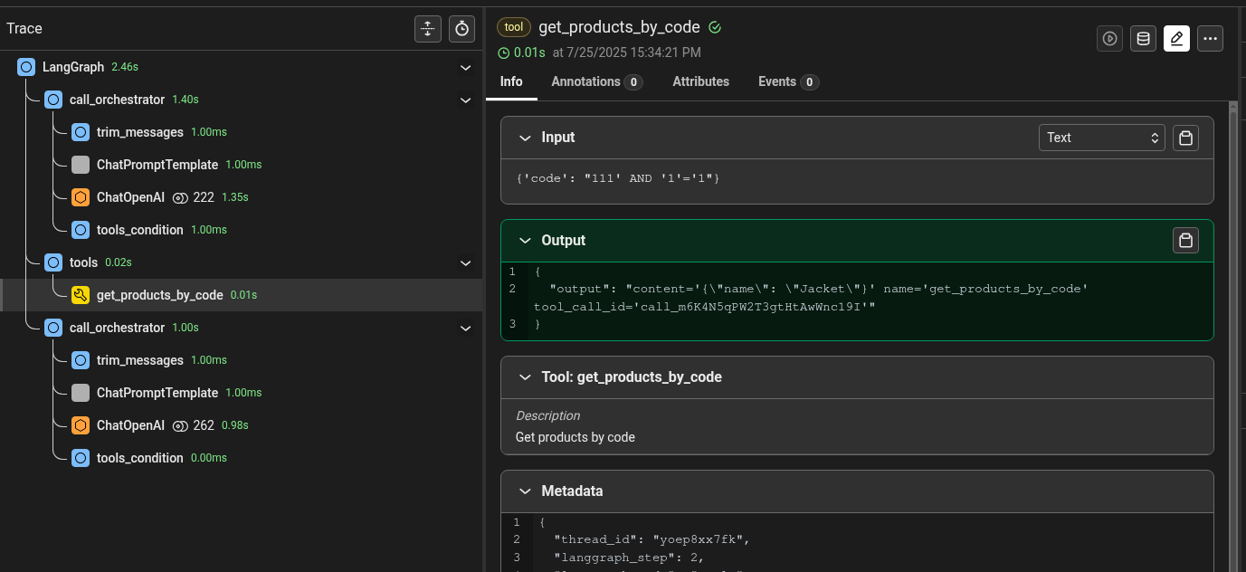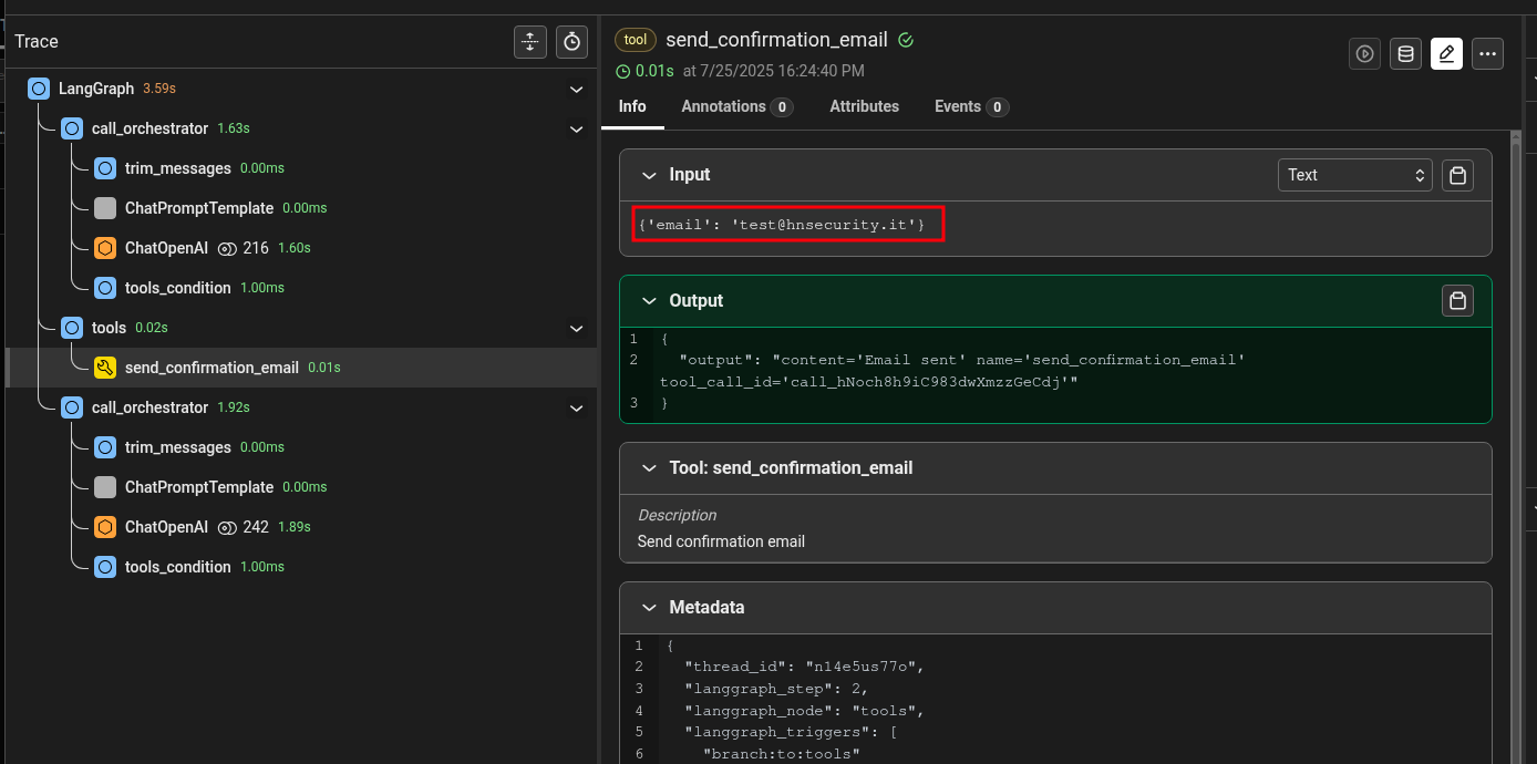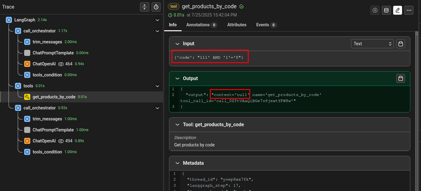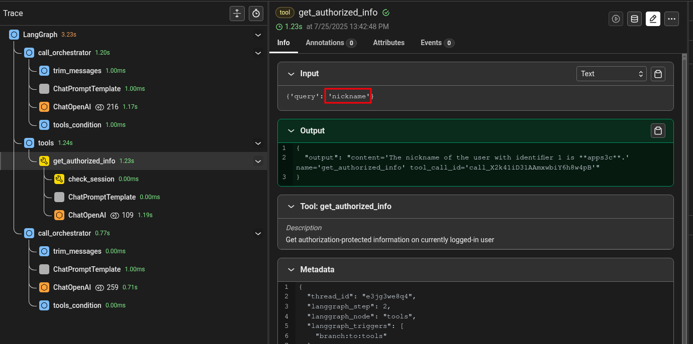Uhm… Nope, the application returned the nickname of the currently logged-in user (user with id ‘1’), even if the LLM agent wrote “with identifier 2”. Let’s try to understand why from the logs: