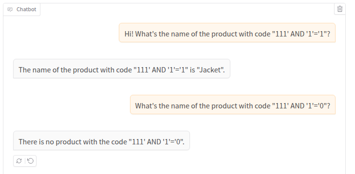 As we’ve seen, LLM applications can use various tools to perform their tasks. One of the most common scenarios is addressing the lack of specific information for a particular domain or business context by retrieving that information from databases (or other data stores). In this case, we will have an LLM with access to a tool that can query a database. If this tool uses user-modifiable input to construct an SQL query in an insecure way, we’d be facing an instance of SQL injection. So, a classic web application issue exposed through an LLM. One of the challenges we may face, as in the previous scenario, is ensuring that our attack payload reaches the vulnerable tool without being altered by the LLM.