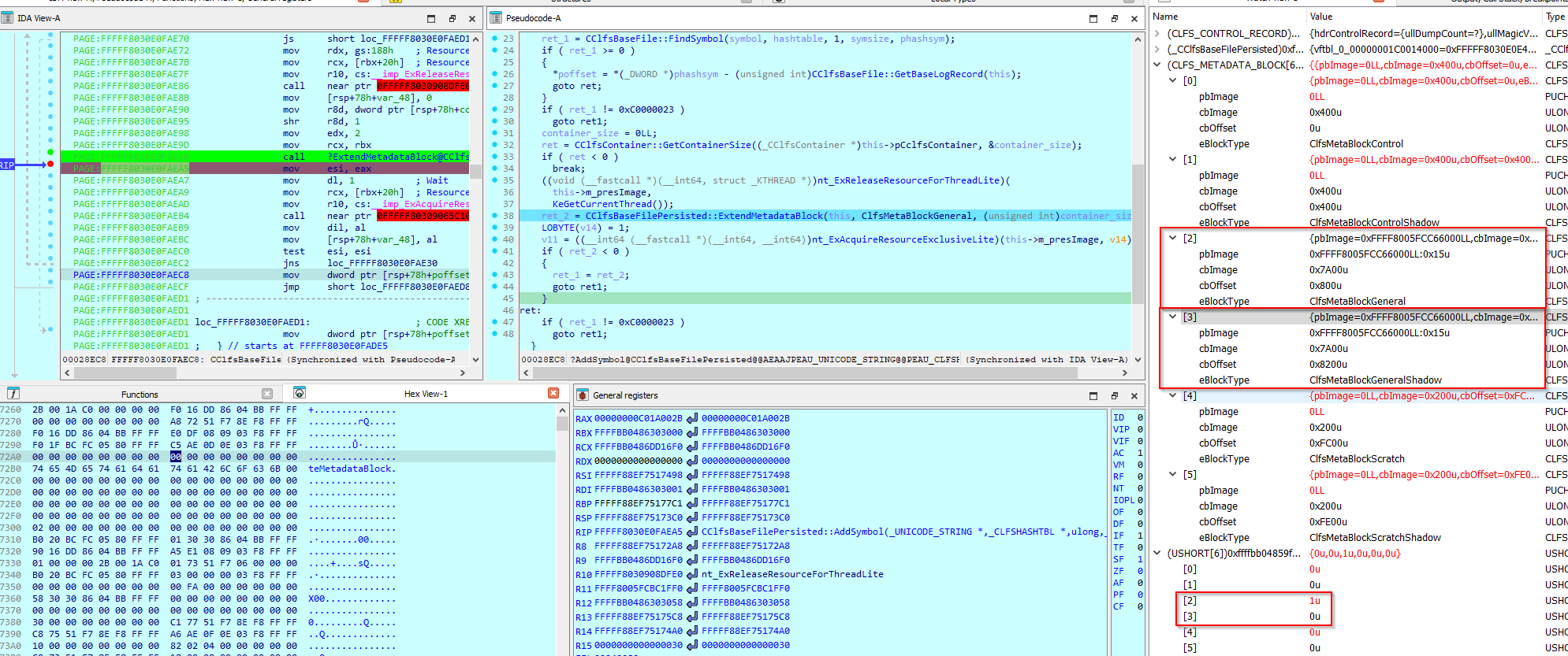 In the previous article, we discussed a vulnerability in the LoadContainerQ() function inside clfs.sys. The root cause of the vulnerability was LoadContainerQ() using a CLFS_CONTAINER_CONTEXT.pContainer without checking if FlushImage() invalidated the General Metadata Block.
