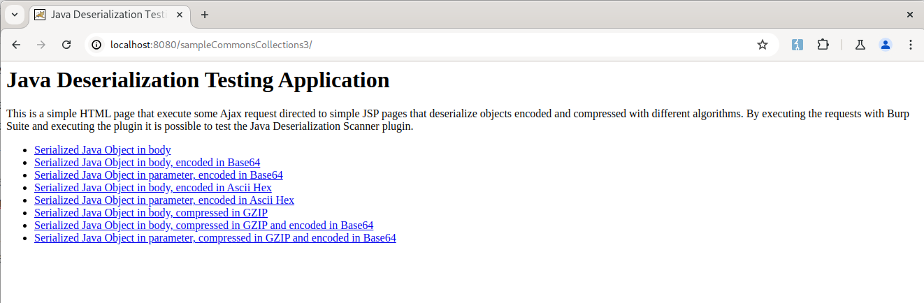 As usual, let’s start from a real scenario. This time we will use a Java application that I developed some time ago as a test case for developing an extension aimed at identifying Java deserialization issues, named Java Deserialization Scanner. The test application, in WAR format, simply deserializes objects received in different ways and with different encodings, and it is easy to add vulnerable libraries to its package.