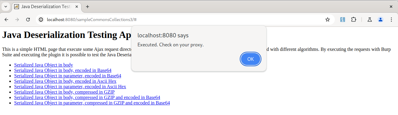 The application is very simple. It offers some links that send a serialized Java object to the backend in different ways and with different encodings (and a backend that deserializes them). Let’s click on “Serialzied Java Object in parameter, encoded in Base64”.