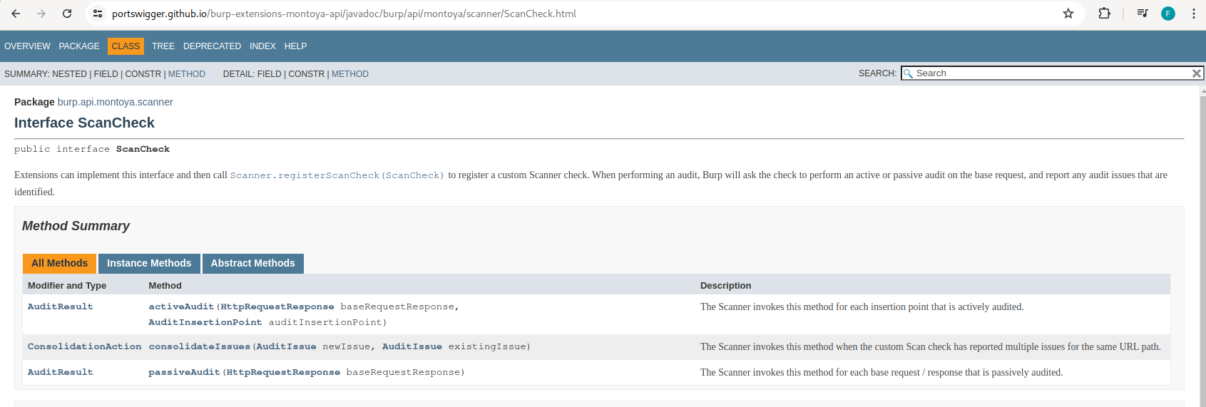 To register our plugin we need to code an object that implements the interface ScanCheck and that will contain active and passive scan logic. The interface ScanCheck is documented as follows: