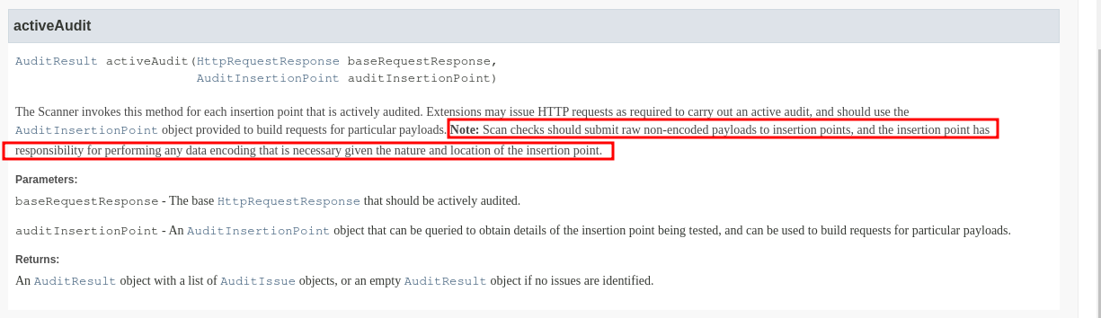 (HttpRequestResponse baseRequestResponse): this method will be called each time Burp Suite’s passive scanner runs. It will be provided with an object containing the request and the response on which the passive scanner was executed, allowing us to perform some checks on it to identify issues passively (i.e., simply by analyzing the request/response without making further requests). The method should return an object that contains a list of identified issues, which will be integrated into Burp Suite’s scanner results. - AuditResult activeAudit