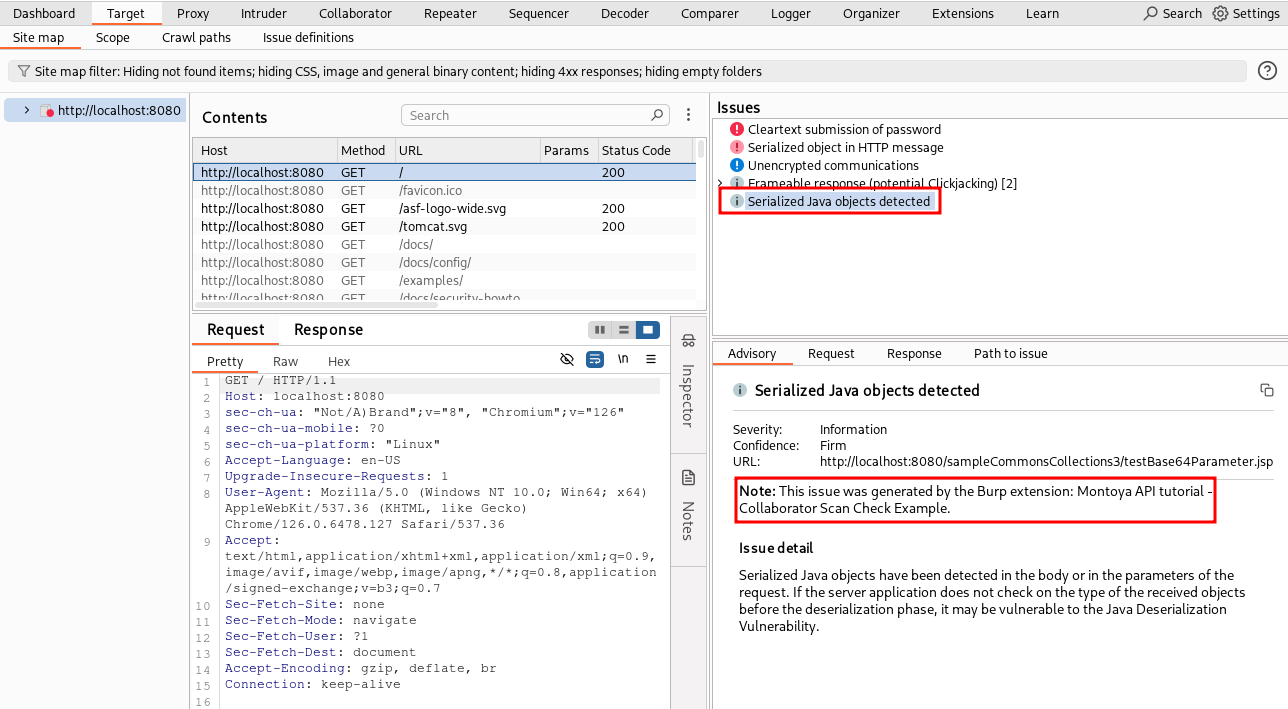 But what will our extension do? Our extension will perform two tasks: it will add a passive check to the scanner to search for serialized objects in HTTP requests (useful for identifying potential vulnerable parameters), and it will add some active checks to the scanner to test if endpoints are actually exploitable, using specific attack vectors for Apache Commons Collections 3. Essentially, we will write a simplified version of the Java Deserialization Scanner using the Montoya API, which only executes payloads for a single vulnerable library (Commons Collection 3) and supports a single encoding (Base64), to keep the example simple.