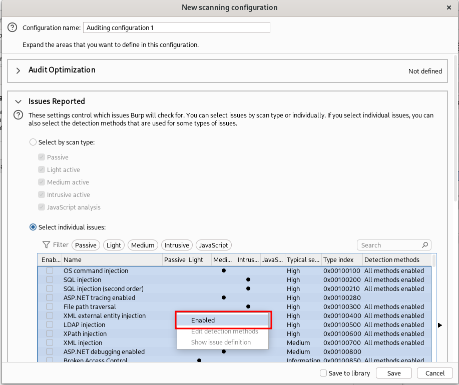 Then in “Scan configuration” create a new configuration and deselect all the individual issues in the “Issues Reported” section (CTRL-A to select all, right click and remove the flag on “Selected):