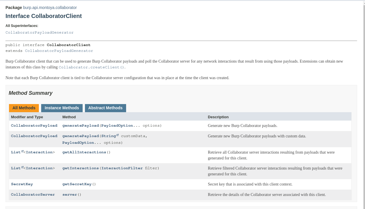 - CollaboratorClient createClient(): this method creates a new Collaborator client, that we can use to generate Collaborator payloads and to retrieve interactions received to those payloads.