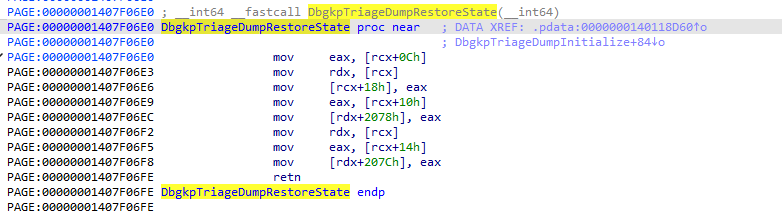 The authors of the blog post discovered nt!DbgkpTriageDumpRestoreState().