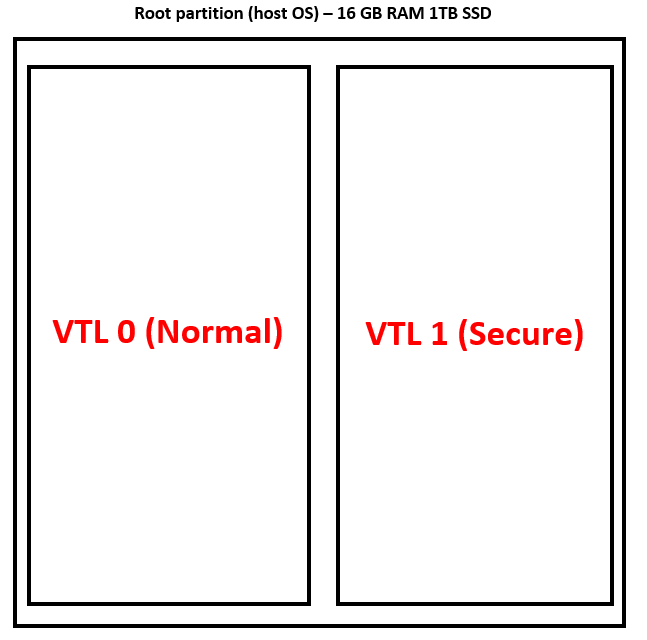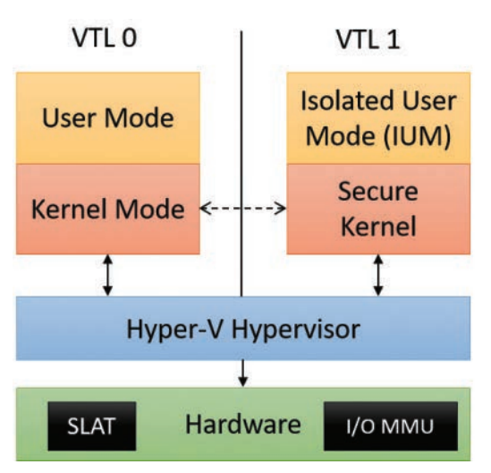 The idea is that VBS, using the hypervisor, creates two Virtual Trust Levels (VTLs), isolated environments similar to virtual machines (but they are NOT exactly virtual machines):