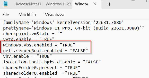 Notice this will enable also Secure Boot. If Secure Boot is enabled you won’t be able to do kernel debugging. To disable it, while keeping VBS enabled, navigate to the folder of your VM and open the .vmx file in a text editor. Change the attribute uefi.secureBoot.enabled to FALSE.