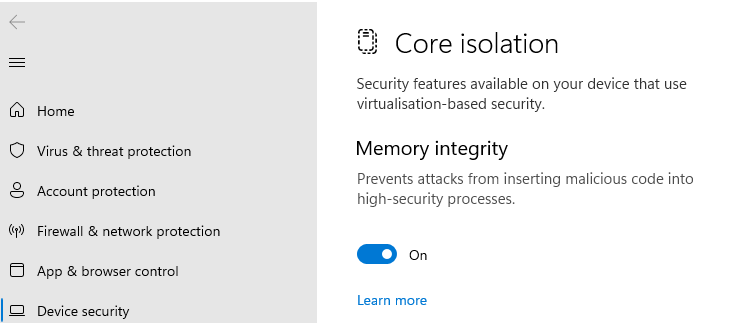 Now, run your VM and inside it open Settings, navigate to Core isolation and set Memory integrity to enabled.