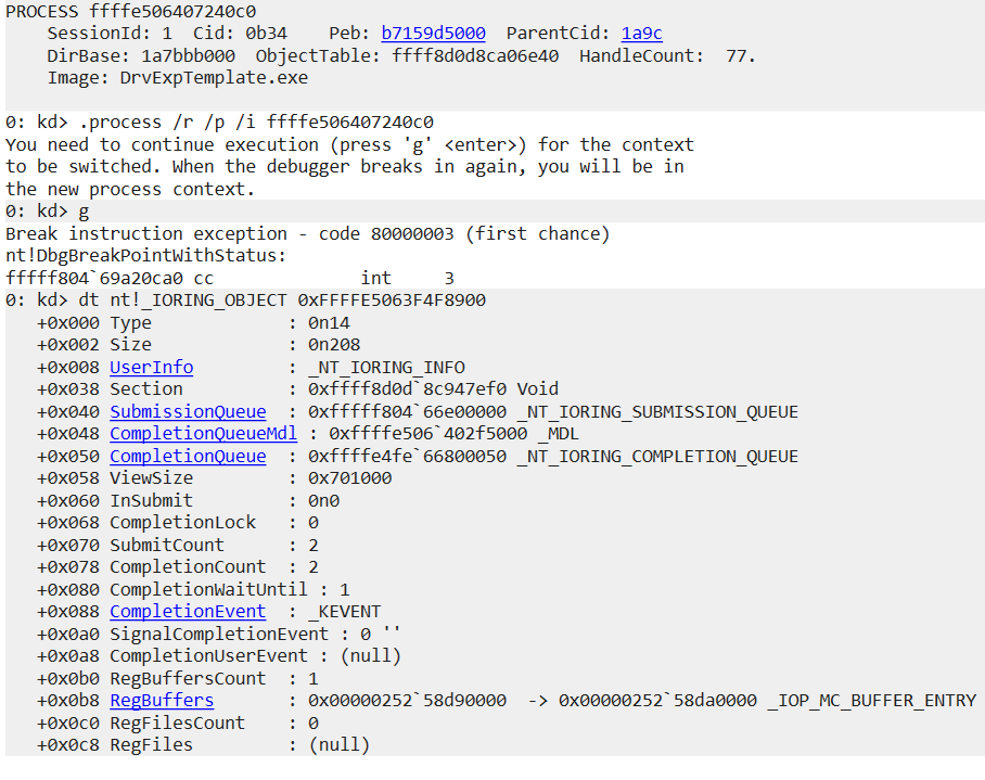 puioring. - Set _IORING_OBJECT.RegBuffers to a dummy array and _IORING_OBJECT.RegBuffersCount to 1 using BuildIoRingRegisterBuffers() and SubmitIoRing() (we have to call every time SubmitIoRing() to perform any operation).