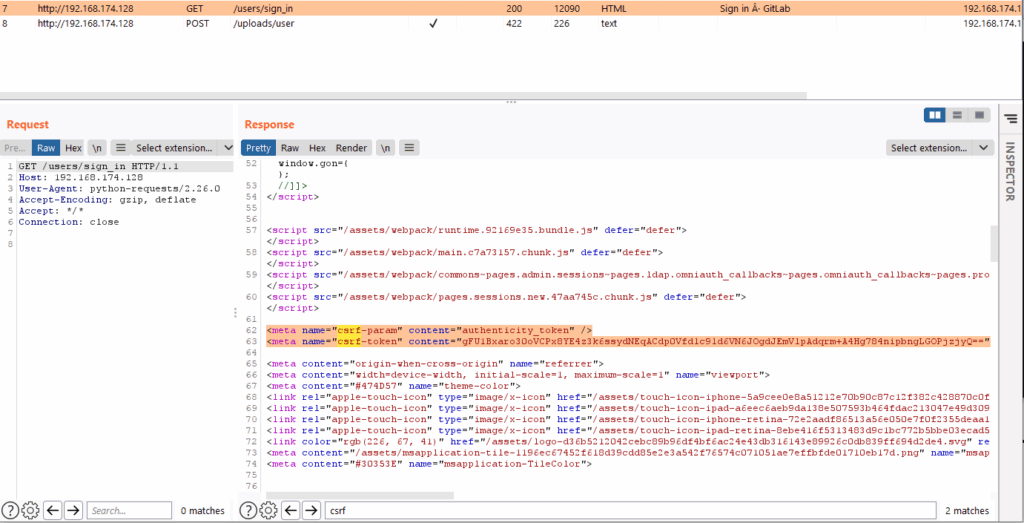 "GET /user/project HTTP/1.1" 200 13567 "" "python-requests/2.25.1" "GET /user/project/issues/new HTTP/1.1" 200 10317 "" "python-requests/2.25.1" "POST /user/project/uploads HTTP/1.1" 422 24 "https://git.victim/user/project/issues/new" "python-requests/2.25.1"