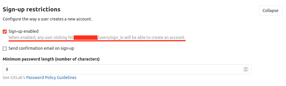 This was possible because this version of GitLab CE permits user registration by default. Moreover, the email address specified during the registration phase isn’t verified by default, thus the newly created user is automatically logged on without any further steps. In addition, no notifications are sent to the administrators.