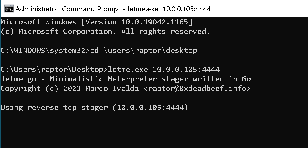 Finally, run letme.exe on the target Windows box with a command such as the following: