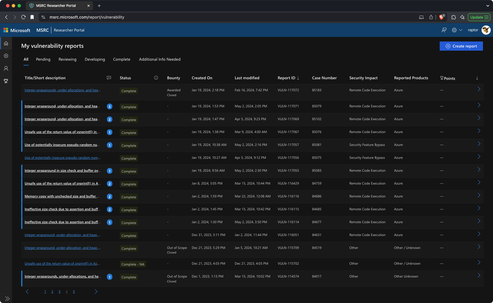 At some point, I stumbled upon Azure RTOS. In December 2023, I reported to MSRC a few vulnerabilities in this OS, two of which were found in a couple of hours of code review and were fixed right away. They alone earned me a whopping 240 points that landed me in the top positions of their quarterly leaderboards!