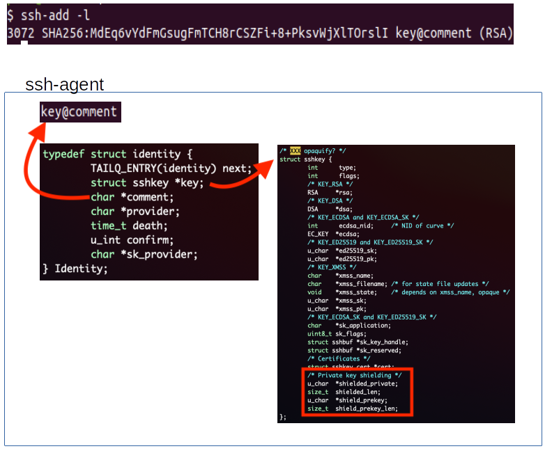 Identities managed by ssh-agent are represented by a (list of) Identity struct which contains a reference to the key comment and a pointer to the associated key; the new shielded key and its pre_key are both referenced within this sshkey struct by the shielded_private and shield_prekey pointers.