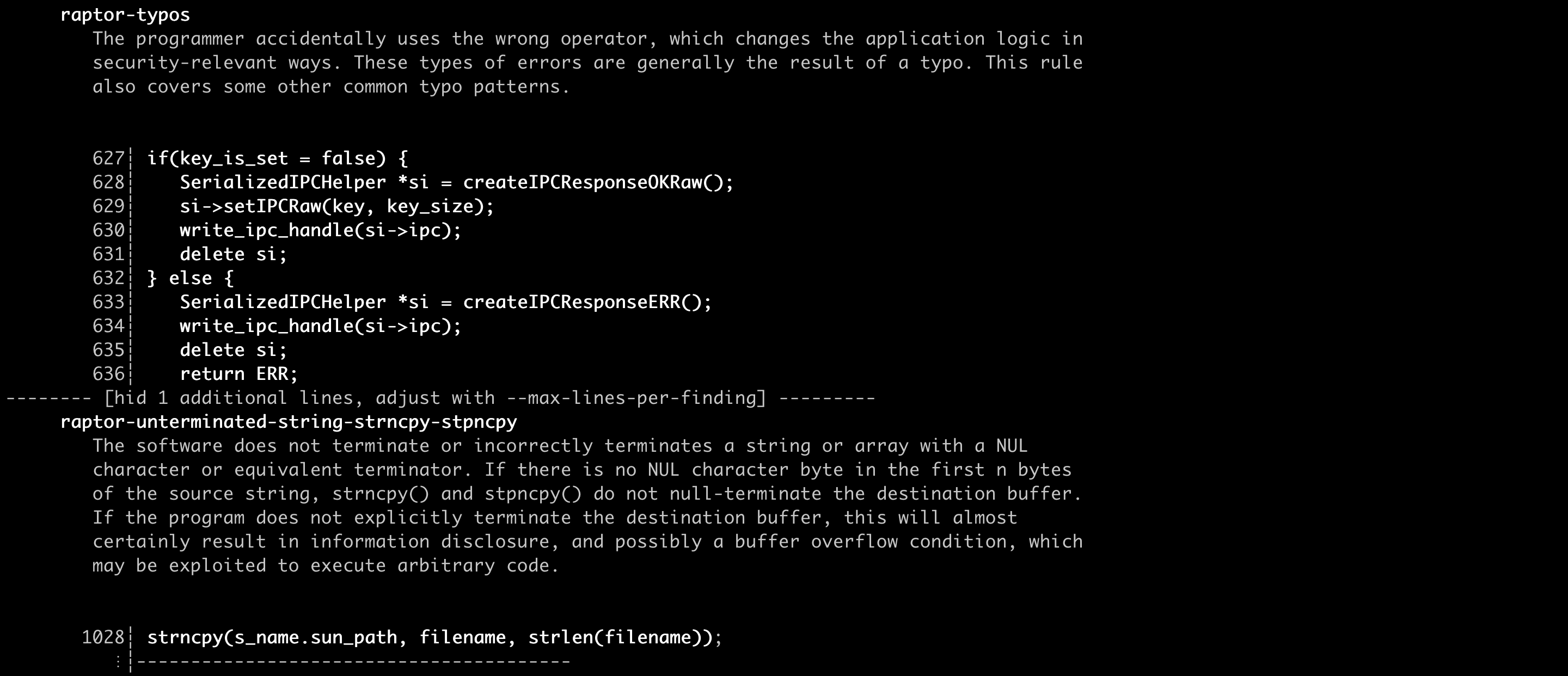 A word of caution. Semgrep’s support for C/C++ is still experimental and somewhat limited, especially if compared with the mature support that some other languages such as Java, Python, and Go enjoy. This means I couldn’t harness the full power of Semgrep’s pattern matching engine. In addition, as most other Semgrep rules, my rules aren’t perfect. That said, they should be able to help you *get things done*. That’s my mantra when it comes to security research.