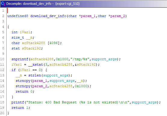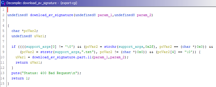 The file “export-cgi” manages file downloads in all sections of the administration interface. Generally, it takes the “category” parameter from the HTTP request and switches between multiple download_XXXXX functions. The pseudocode (generated by Ghidra) of the “download_av_signature” function is: