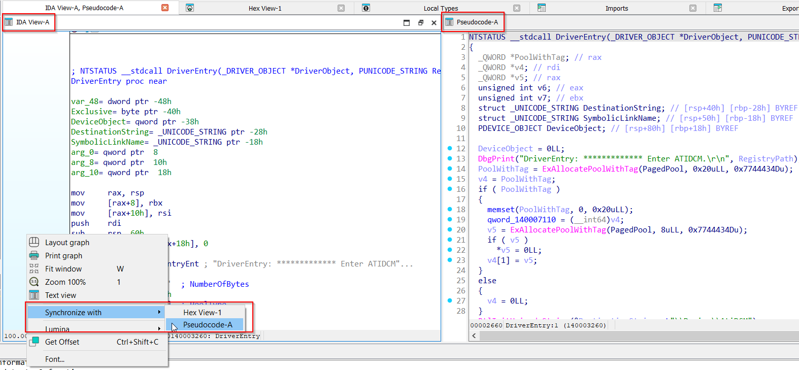 If you want you can also further synchronize the Hex View with IDA View and Pseudocode windows using the same procedure. Right-click on the Hex View window and then select Synchronize With -> IDA VIEW A - Pseudocode - A.