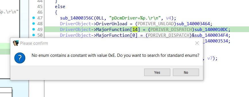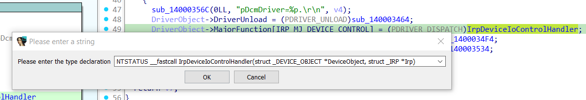 Taking the CurrentStackLocation->Parameters we can see that it’s a union that changes based on the IRP Major Function Code handled. As the current function handles a IRP_MJ_DEVICE_CONTROL function code, we should use CurrentStackLocation->Parameters.DeviceIoControl in IDA Pro.