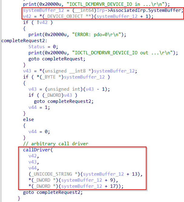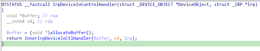 The most interesting part of the function is the last line. It calls a function pointer inside the MajorFunction array part of DriverObject part of DeviceObject. Since we can control DeviceObject then we can control the function pointer inside the MajorFunction array. This grants us the ability redirect the execution flow to an arbitrary location!