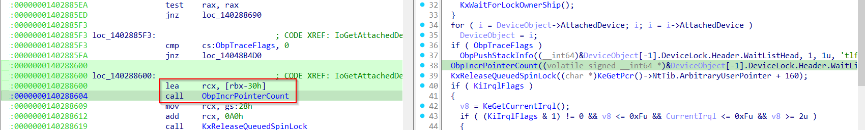 We can see that basically it walks the DeviceObject->AttachedDevice linked list and then returns the last element in the list. In addition, before returning we can see a call to ObpIncrPointerCount() passing as input DeviceObject-0x30. It is easier to see it in the disassembly listing (rbxcorresponds to DeviceObject):