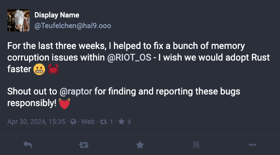 - 2024-04-06: started collaborating with RIOT to evaluate proposed fixes.